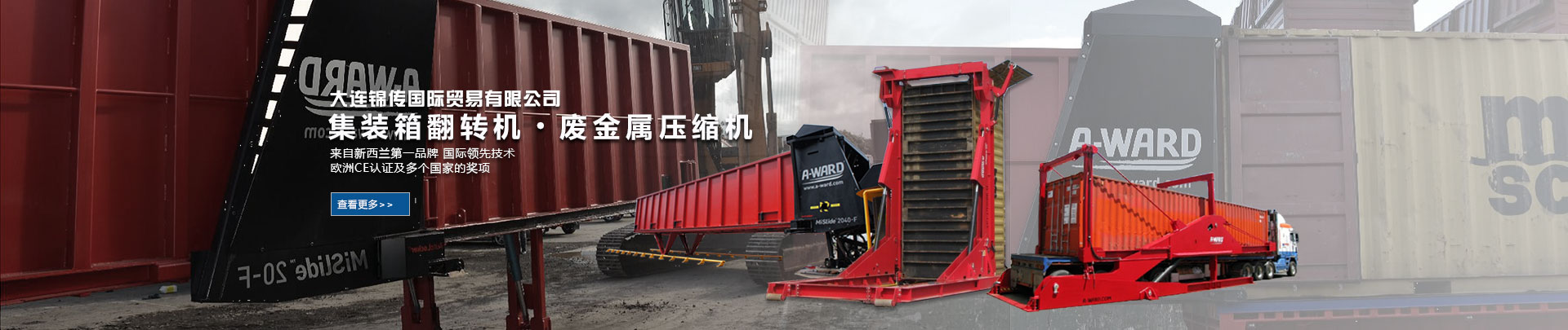 大連錦傳國際貿易有限公司于2013年11月與新西蘭A Ward公司達成戰略合作,成功代理集裝箱翻轉機、廢金屬壓縮機等產品在中國大陸的銷售、維護及保養業務。本公司重合同、守信用,保證產品質量,以經營多種特色的產品和薄利多銷的原則,贏得了廣大客戶的信任與厚愛?,F長期出口產品至澳大利亞,巴西,德國,俄羅斯,哥倫比亞,美國,泰國,羅馬尼亞,新西蘭 ,意大利,越南,印度,印度尼西亞等國家。